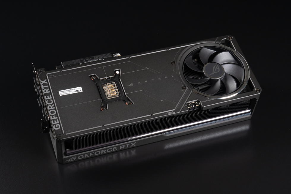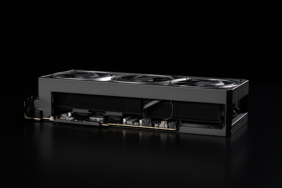 來到顯卡背部,整張卡設計風格十分科幻,高質量壓鑄框架、護蓋和背板緊固支撐PCB以確保剛性,再搭配啞光磨砂質感噴塗,猶如浩瀚宇宙中的星艦戰船。