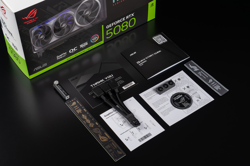 豐富配件如下:ROG信仰尺、顯卡支架、顯卡造型鍵帽、12V-2x6轉3×8pin供電線、304不鏽鋼冰箱貼、定製紮帶、ROG徽章,以及若干紙片。