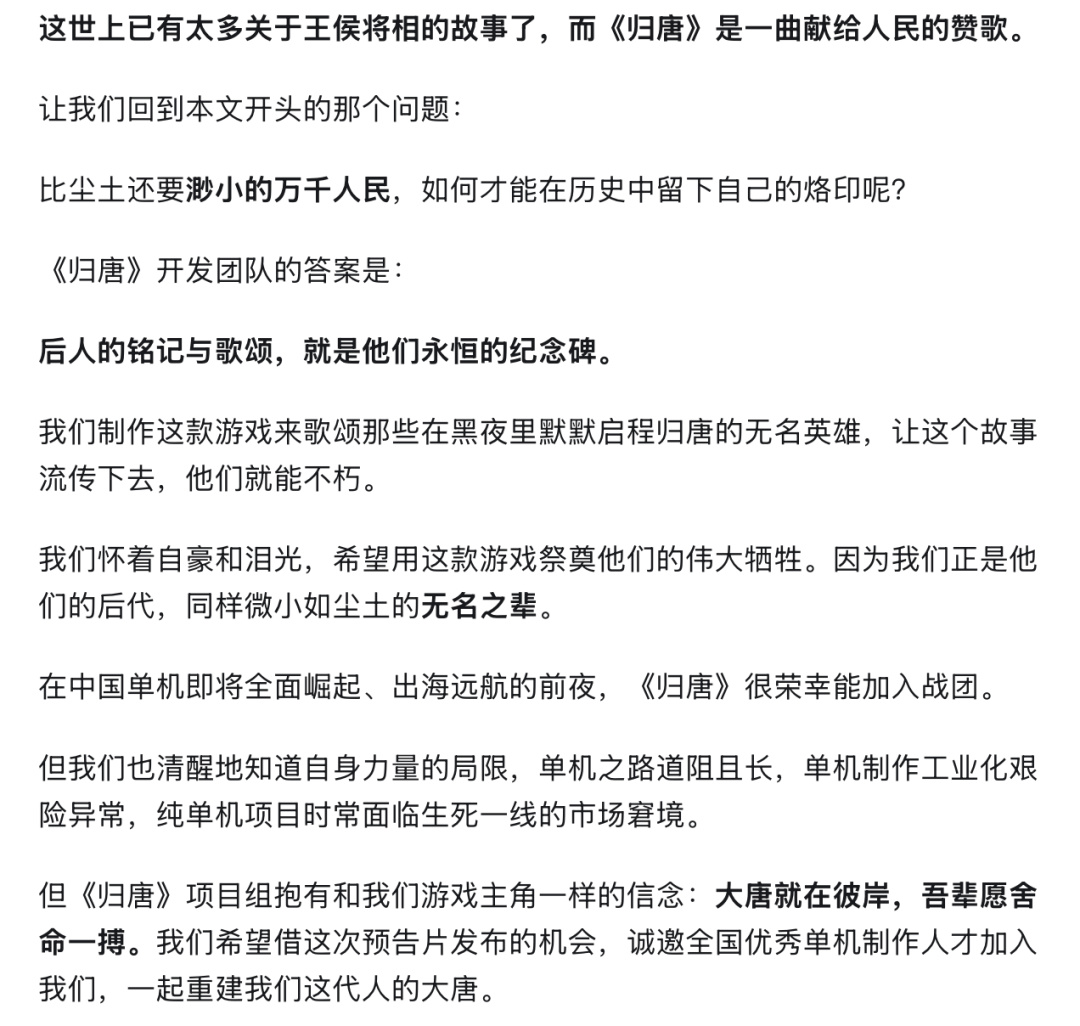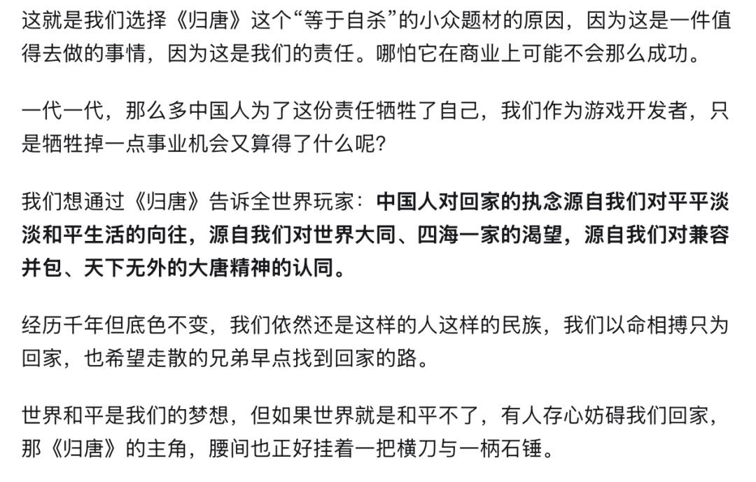 所以,哪怕这个游戏在商业上可能不会那么成功,哪怕《归唐》是一个“等于自杀”的小众题材,但正如官方账号吐露的心声: