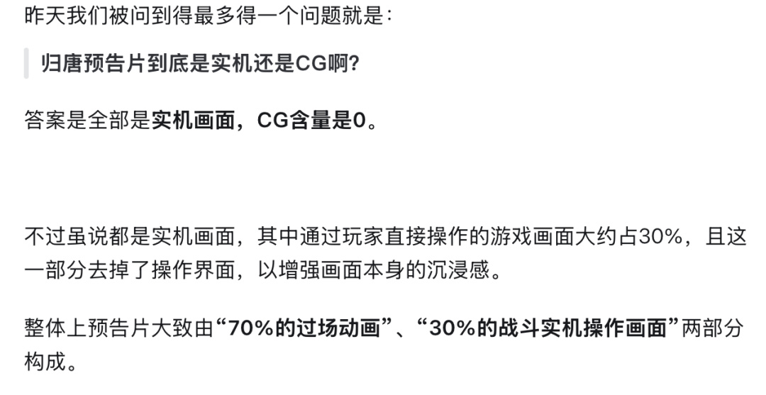 为了避免玩家误解,官方紧接着补充说明,整体预告片大致由“70%的过场动画”、“30%的战斗实机操作画面”构成。