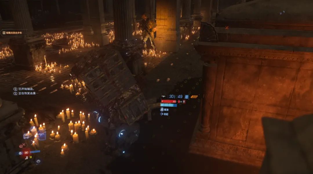 到了对人或者说对尼尔的BOSS战,就回到制作人的舒适区了,也就是“捉迷藏”。第一场中,战场就有很大的高低差,最高的教堂、塔楼,中间高度的空中走廊、可进入的居民楼,再到平地的围墙、墓地,虽然人数上并不平衡,但视野优势让玩家依然有翻盘的底气。第二场没有了可进入的建筑物,复杂度相对降低,但巨幅增加了高低差。低重力设定让玩家有了相当夸张的机动性,但不断生成的冰柱会限制你的战场范围,逼迫你加快速度或者转变打法。这些设计让整个战场充满变数,也让打法更加丰富。至于第三场,就留给玩家们自己体验了。
