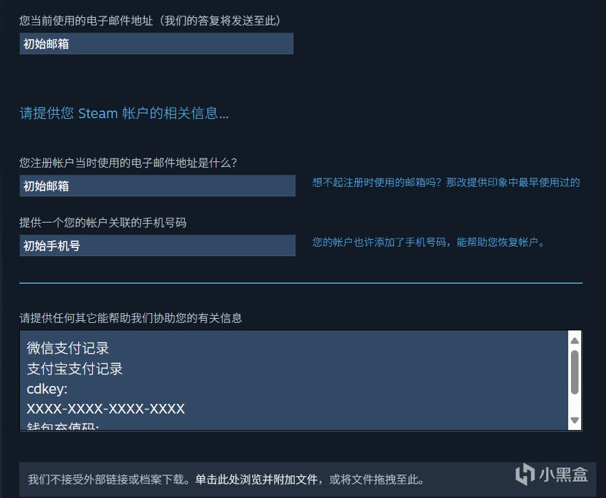 就填寫初始郵箱+初始手機號 和下面文本框(其他填什麼微信號碼或者cdkey號碼的都跳過空着)