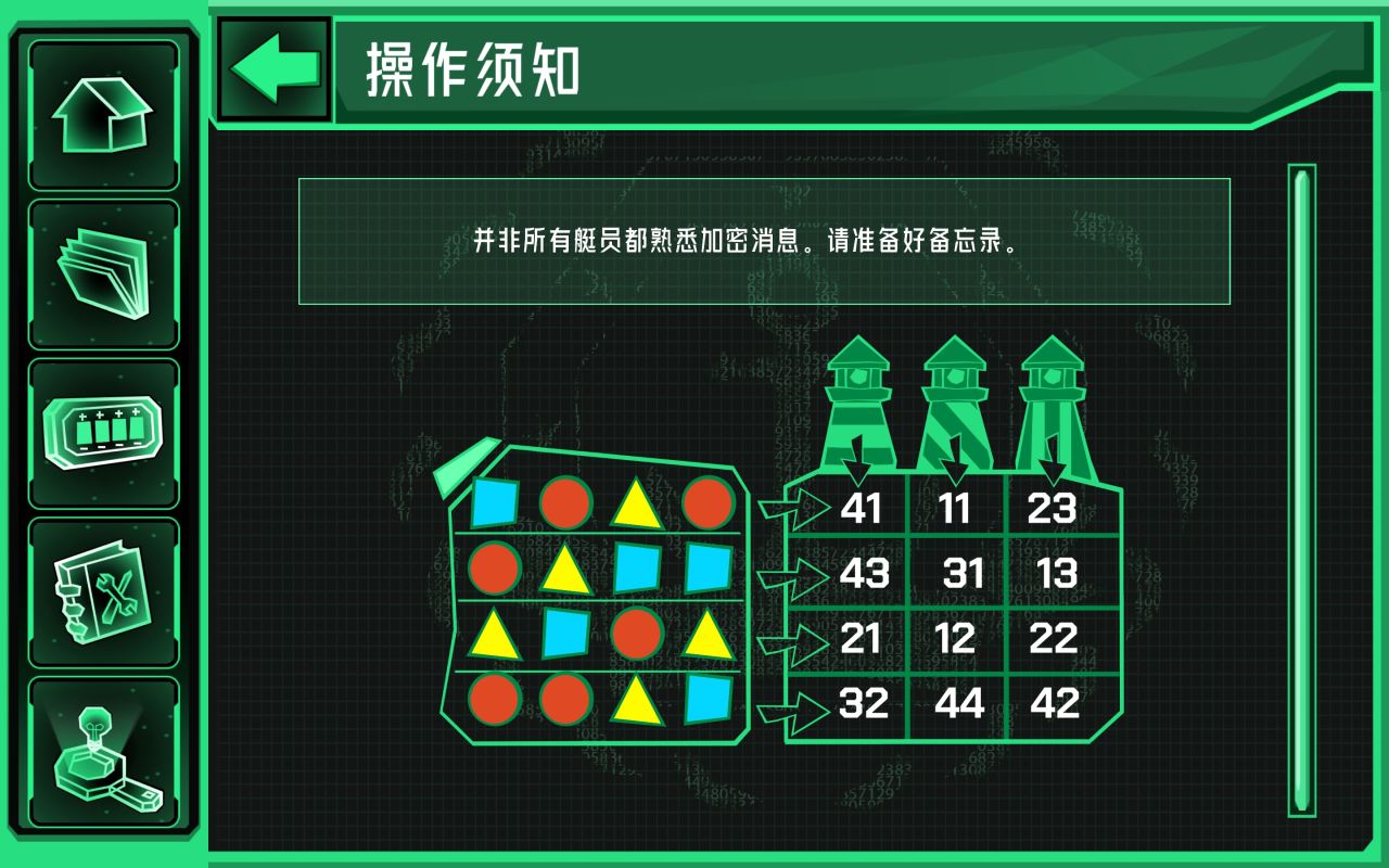 以第一个场景的第一个谜题为例,3个灯塔的条纹形状及其闪烁灯光的颜色形状,与密码本联系起来,组成一个六位数密码。