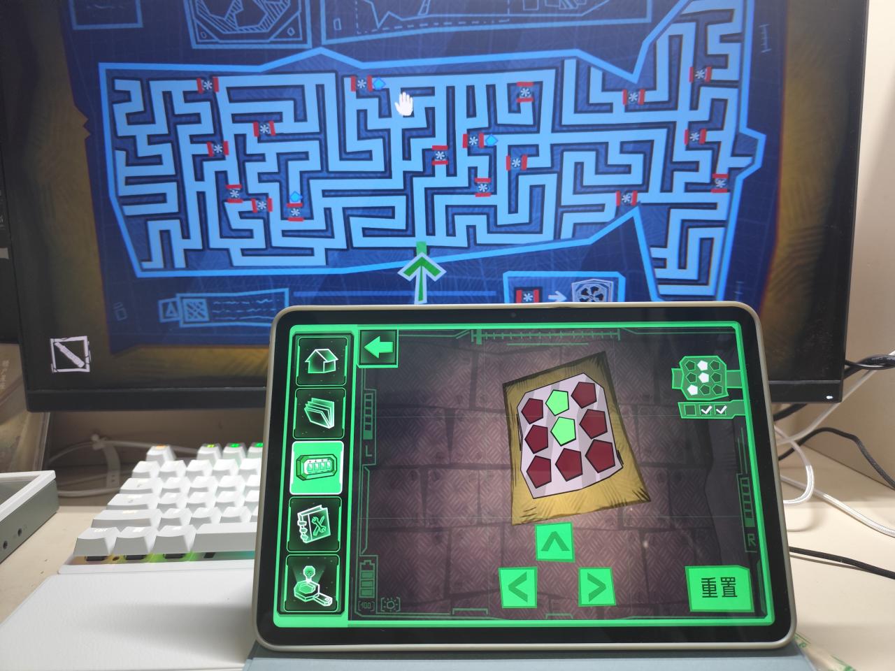 例如,这道关卡,玩家需要前往迷宫3个位置搜集密码图案。电脑上显示迷宫平面图,平板上则是3D迷宫。