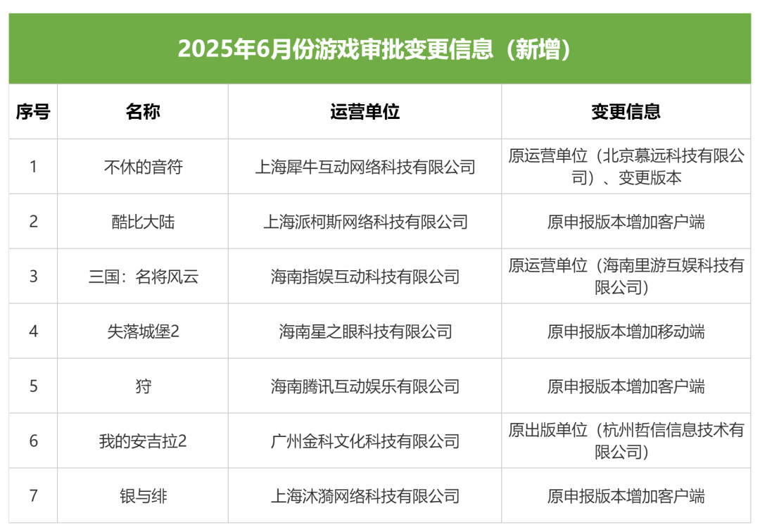 审批信息变更的产品主要包括:腾讯《狩》增报客户端版本、沐瞳《银与绯》增报客户端版本、Hunter的《失落城堡2》增报移动端版本。