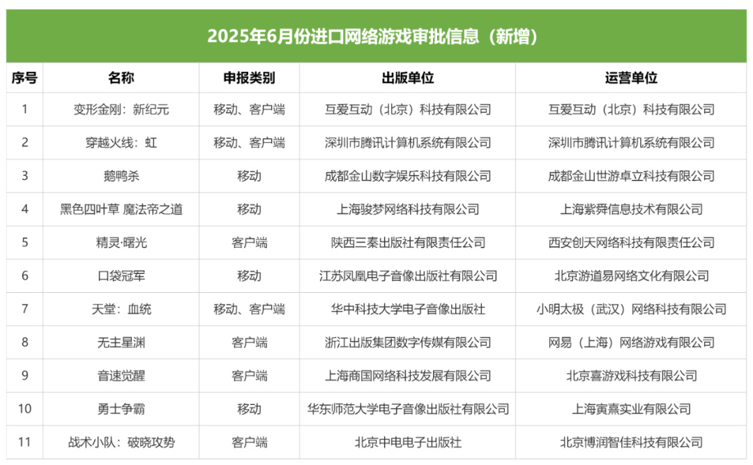 获得进口版号的产品主要有:腾讯《穿越火线:虹》《战术小队:破晓攻势》、网易《无主星渊》、金山世游《鹅鸭杀》、互爱互动《变形金刚:新纪元》、紫龙《黑色四叶草 魔法帝之道》。