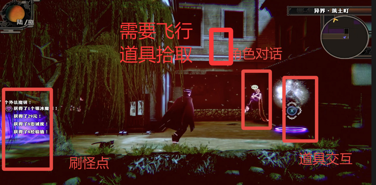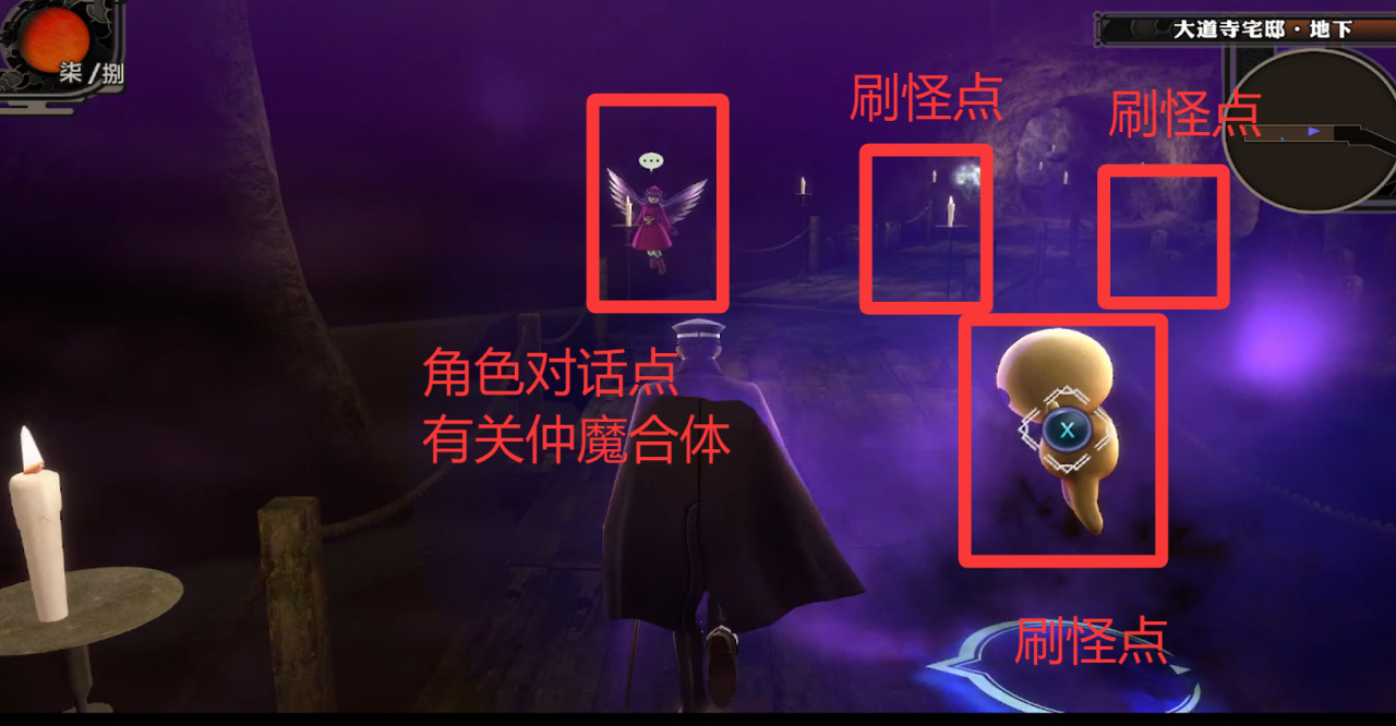右侧则是有如图所示两个刷怪点以及一个角色对话,上方道具需要一个可飞行的仲魔才能够拾取