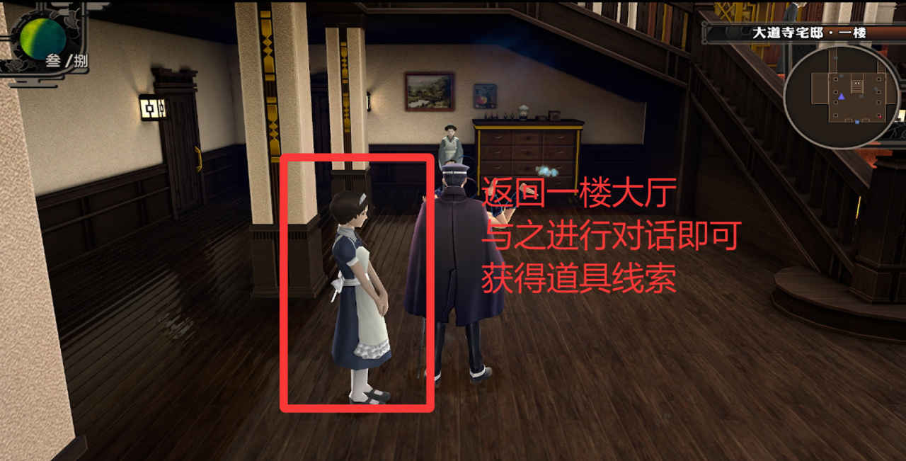 返回一楼大厅,与如图所示的女仆对话即可获得红酒线索
