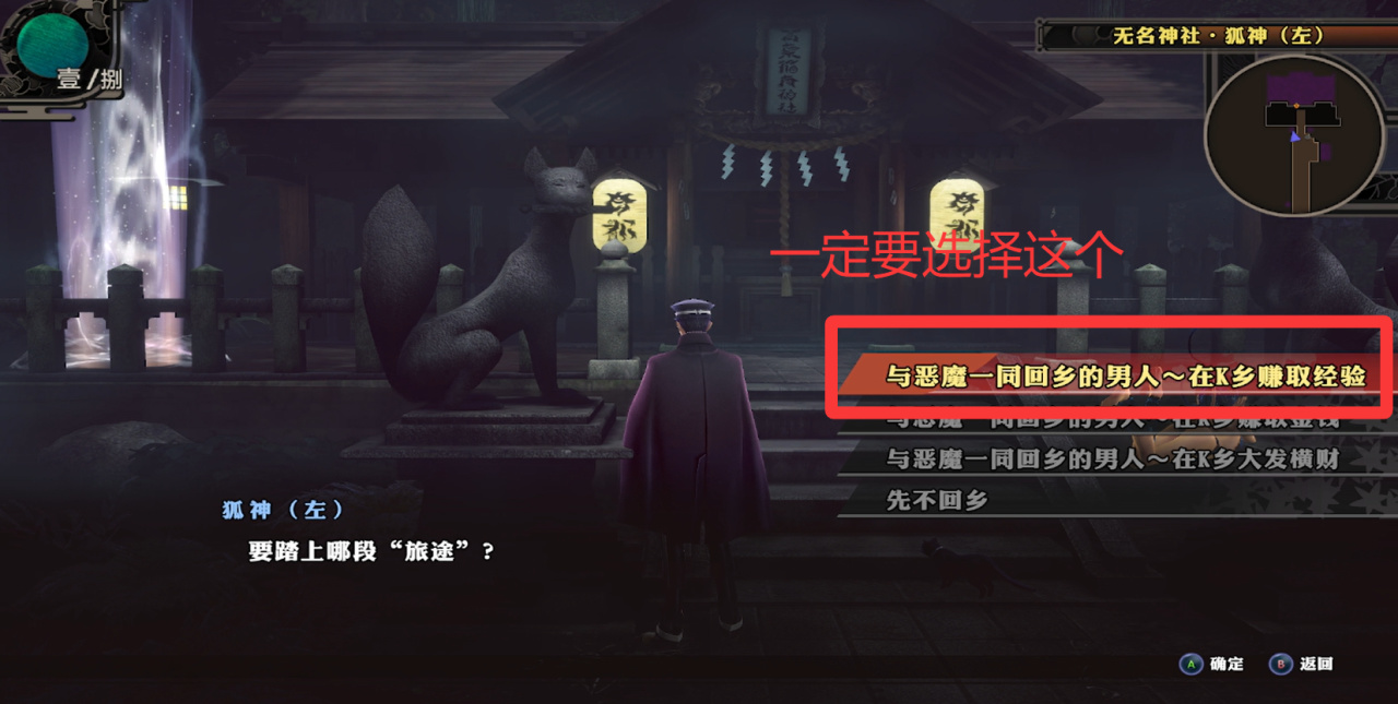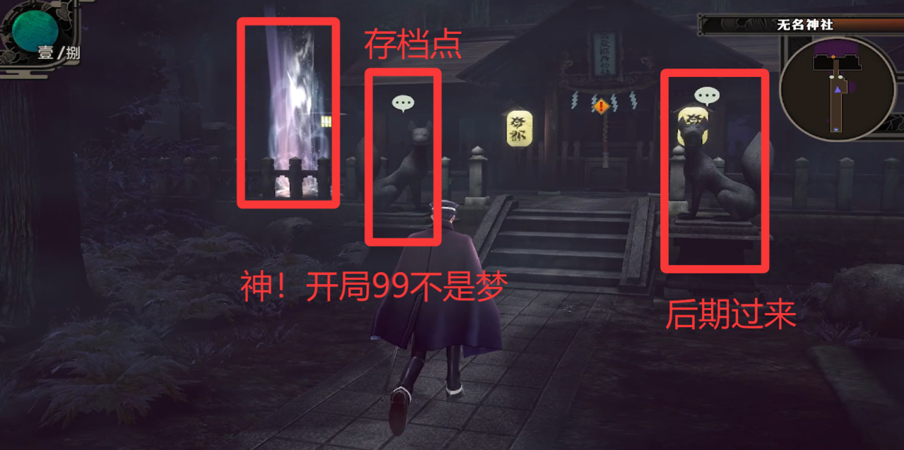 进入神社之后,先不去碰主线剧情,这里的话就给大家介绍一下如何通过20分钟的时间直接开局到达99级,右侧的狐狸需要后期才能够解锁,左侧是一个存档点。左侧狐狸交互之后我们可以回到葛叶修炼场,然后开始我们的刷书过程!