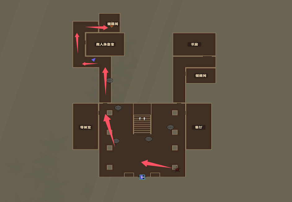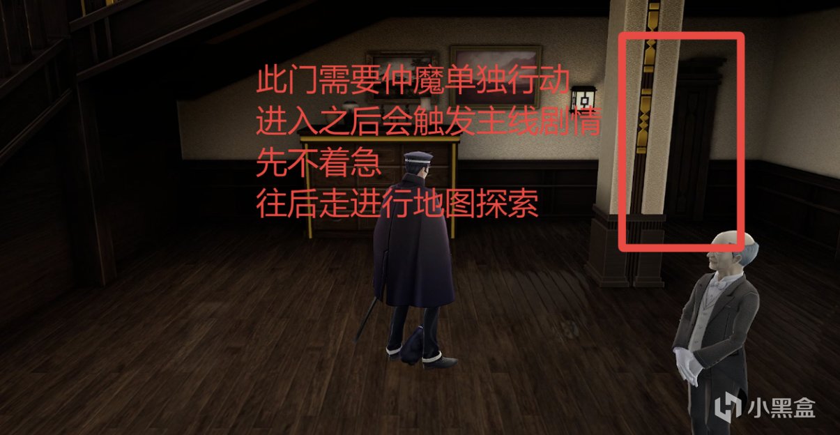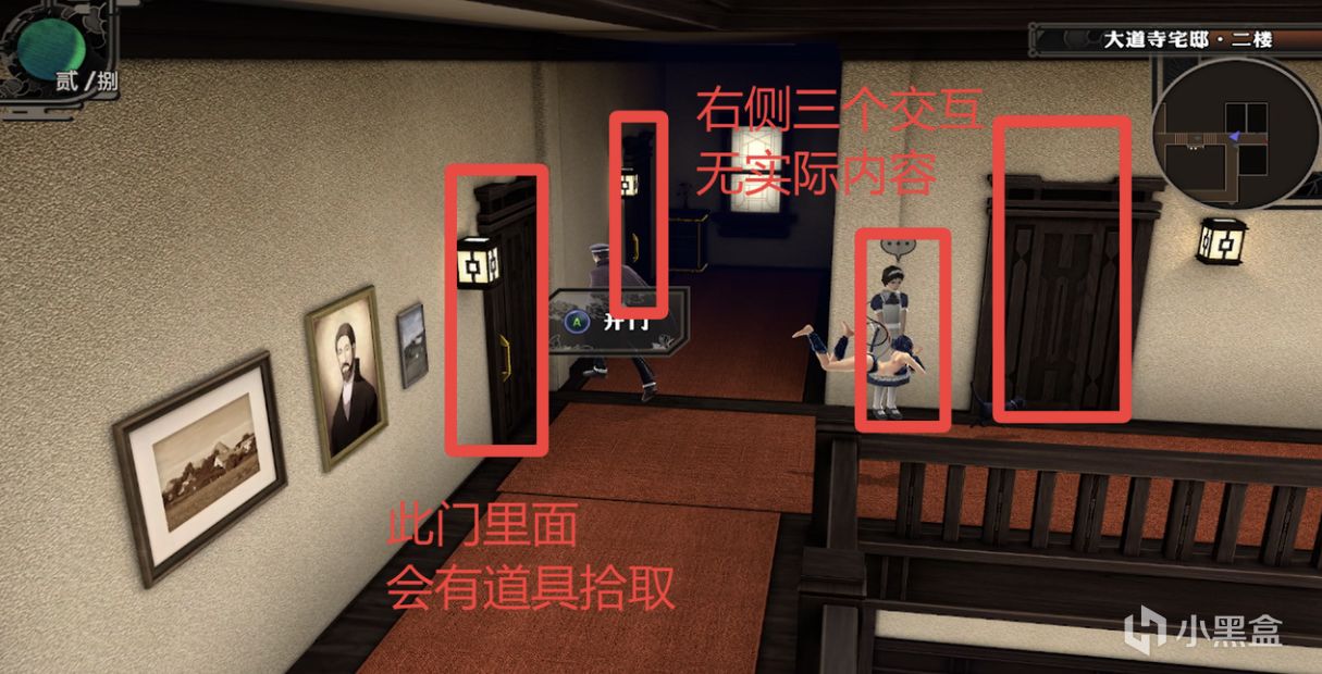 按照上一个图的箭头指示来到这里,图中最左侧的房间之中可以拾取到道具【昂贵的啤酒】,右侧两个房间无内容,右侧还有一个女仆可以偷听心声,之后我们的二楼全部内容已经收集完毕!