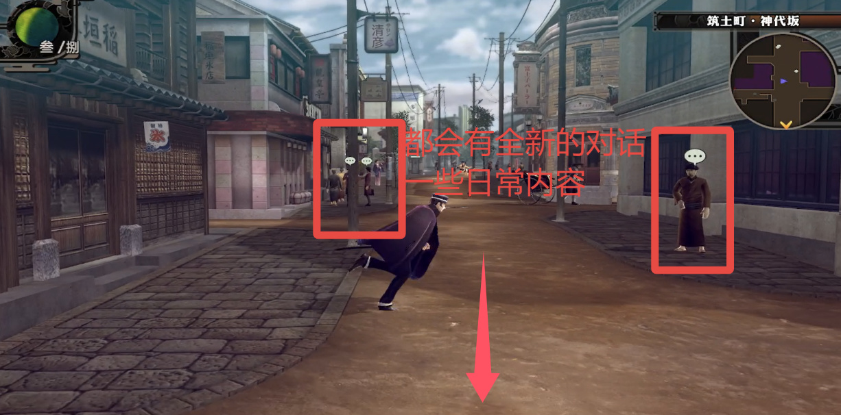 沿着街道跑回来的路上能够看到这些NPC头上都有着全新的对话,有兴趣的话可以过去聊天听一听。然后按照着箭头指引方向一路向前走到底即可!