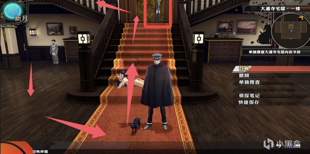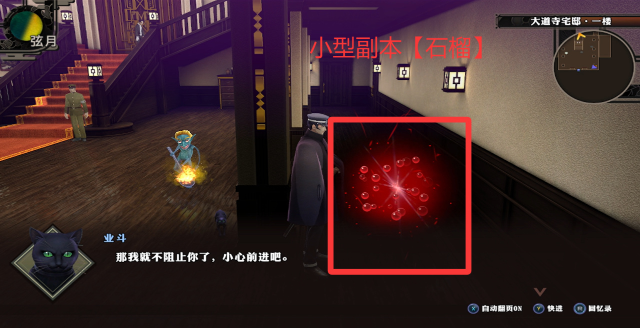 一段CG剧情之后,我们会出现在如图所示的地方,图中框选的地方需要使用到仲魔单独行动的技能,我们先不着急着进去而是往后走,先探索一下府邸里面的一些地图