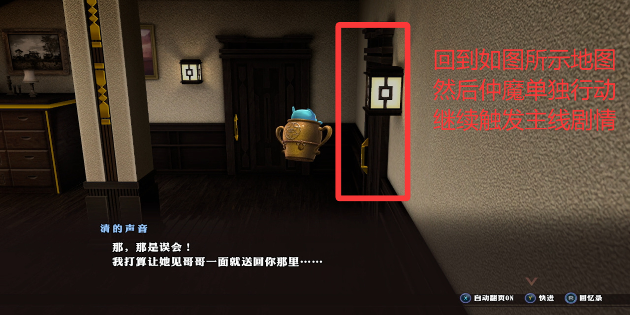 回到一楼右侧,我们使用仲魔单独行动即可进入如图所示的房间之内,我这里因为选择的仲魔可能会被和谐所以我就自己动手先和谐了,进入之后直接一路走到头即可触发主线剧情