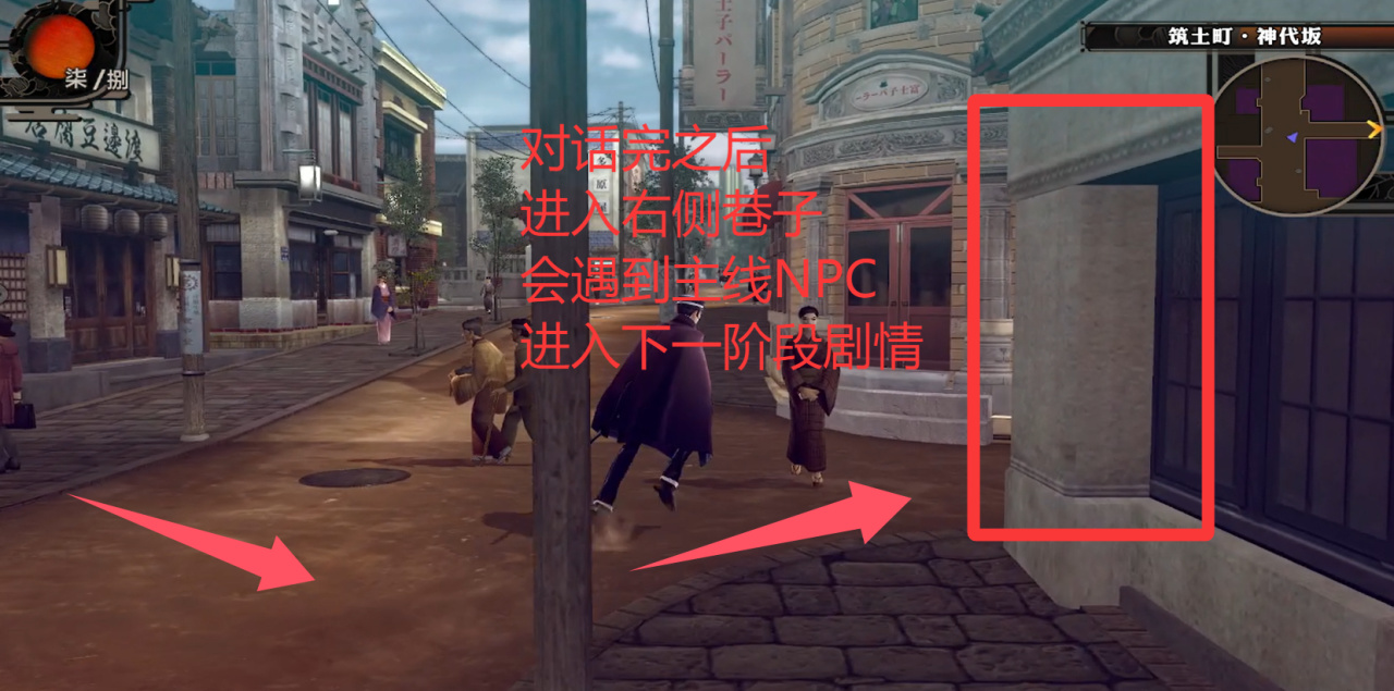 对话完之后按照箭头进入右侧巷子,里面会遇到关键的NPC角色然后触发我们的第一次大型副本