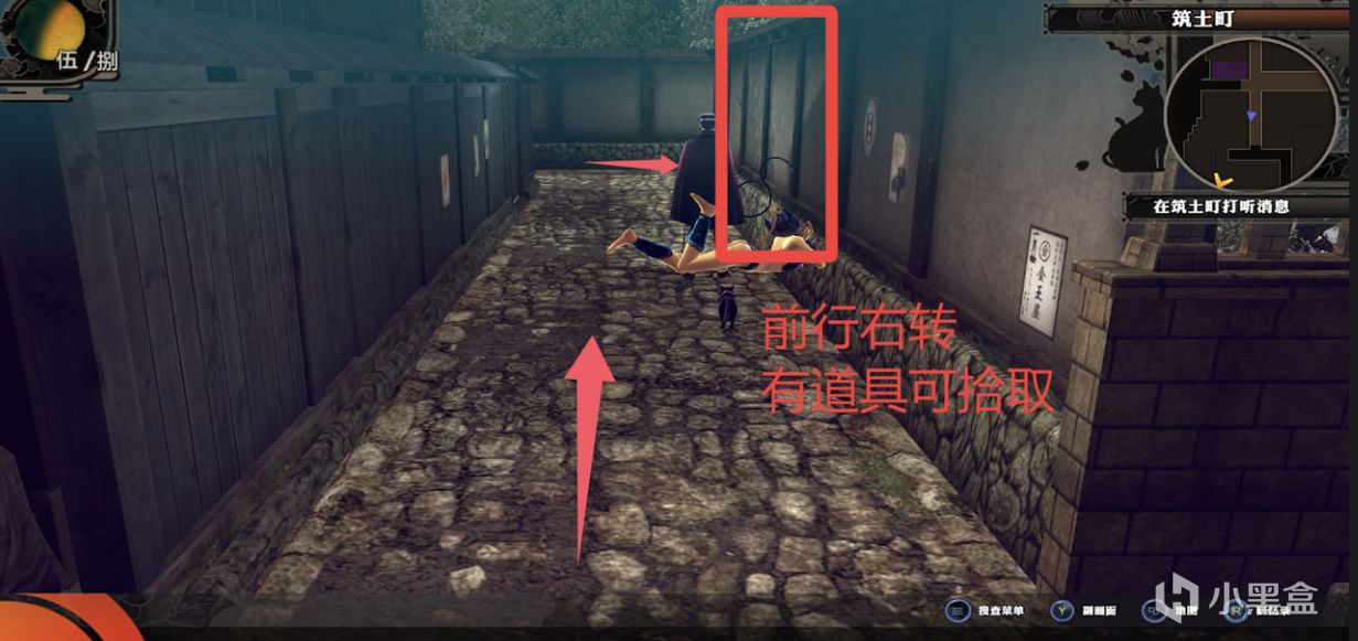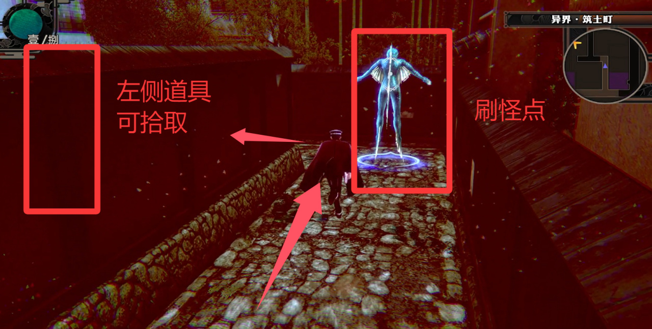 小巷子里面也有一个刷怪点,左侧死胡同李勉有个可拾取的道具,拿完之后我们原路返回继续前进