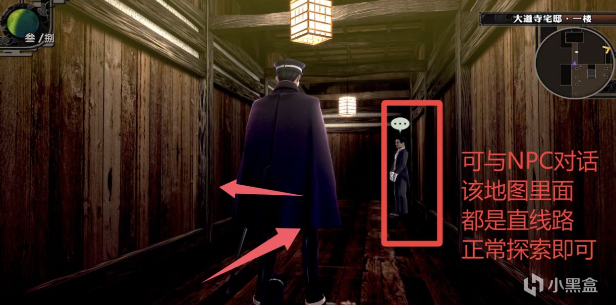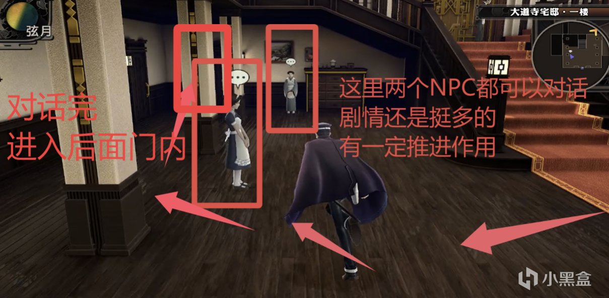 回到大厅之后,我们一层的内容都已经探索完全了,接下来是直接通过箭头所示指引前往二楼探索,楼梯中间会有一个NPC可以对话,然后我们从左侧上去