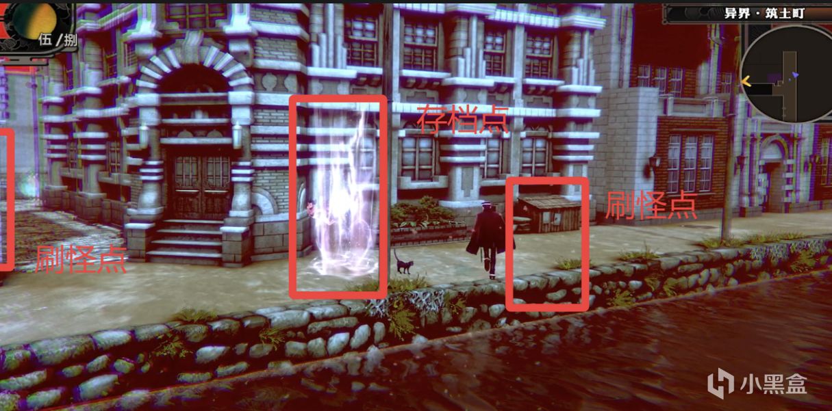 右侧事务所前面刷怪点如图所示,并且有一个存档点,然后从巷子里面继续前进