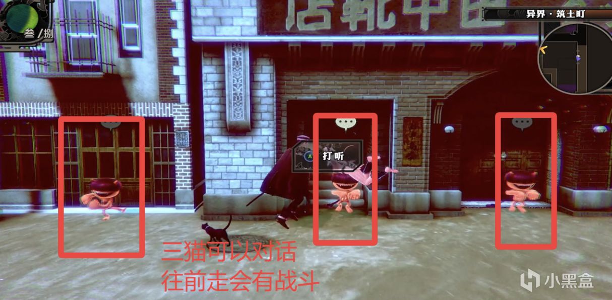 继续往前走会遇到三猫,会有对应的对话,如果再往前的话则会触发三者战斗,在这里不能够捕捉