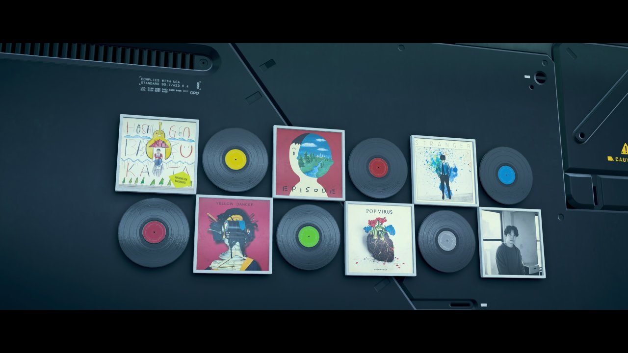 【音乐家】中,右面的墙上还挂着一些星野源的专辑/歌曲,还有一张现实中他本人的照片。