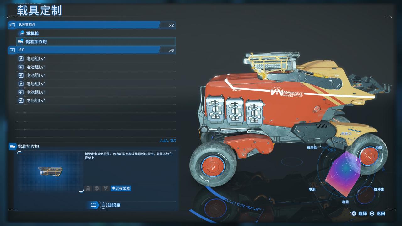这里解锁的【黏着加农炮】、【重机枪】可在载具定制中选择安装在车上。