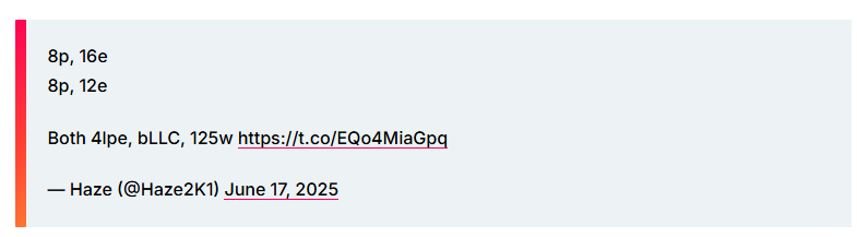 依照该爆料者的信息,将会有一款Ultra9和一款Ultra7处理器加入bLLC缓存,类似于AMD通过额外的3D V-Cache tile在锐龙处理器上的作用,而这两款处理器将配置为8P核心+16E核心和8P核心+12E核心,此外还有Nova Lake本身增加的4个LP-E核心。