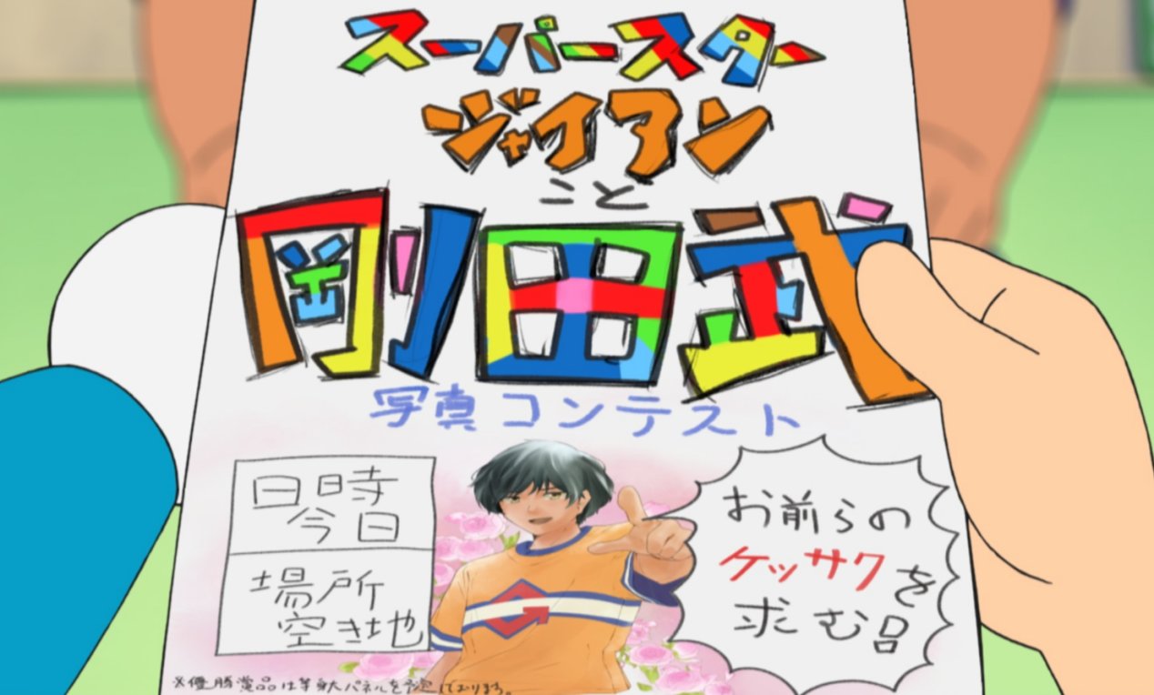 得知此事的胖虎心生一计,于是就拜托(强迫)哆啦A梦造自己的立牌,并要求所有人在今天都要参加胖虎立牌的摄影大赛,最佳摄影者的奖品将会是超大的胖虎等身立牌。该说不说这张活动邀请函的槽点实在是太多了,先不说最上面马里奥风格的标题字体,这下面二次元帅哥版的胖虎立绘是认真的吗。(乐)