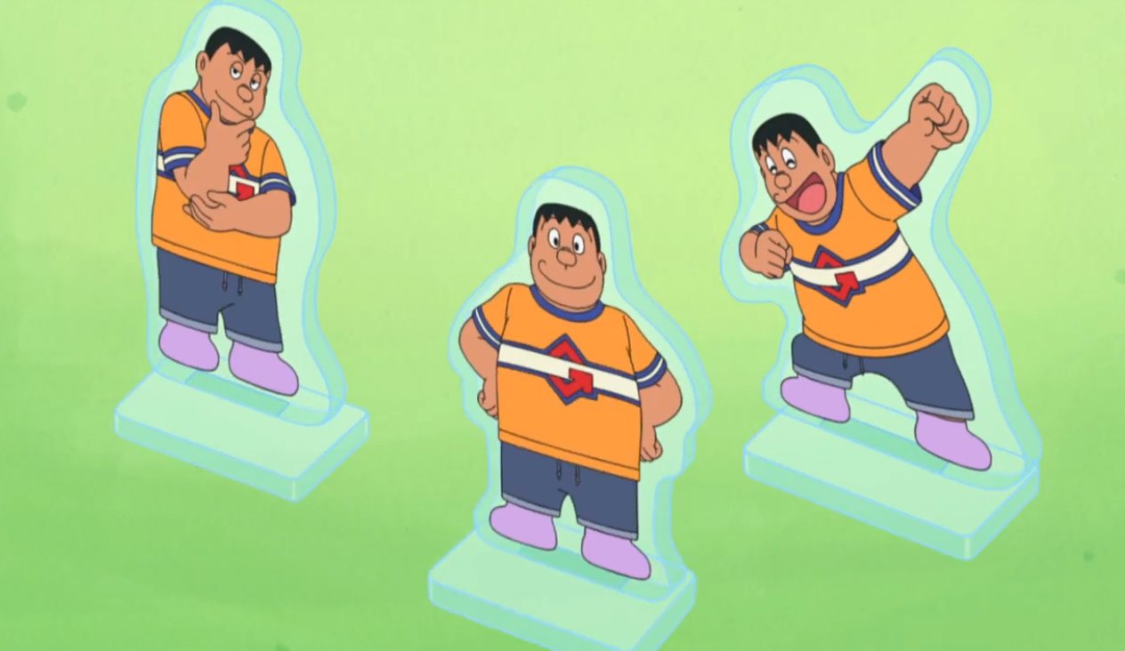 打印了三种造型的立牌后,胖虎又觉得少了些震撼感,又让哆啦A梦赋予了这些立牌说话的功能。