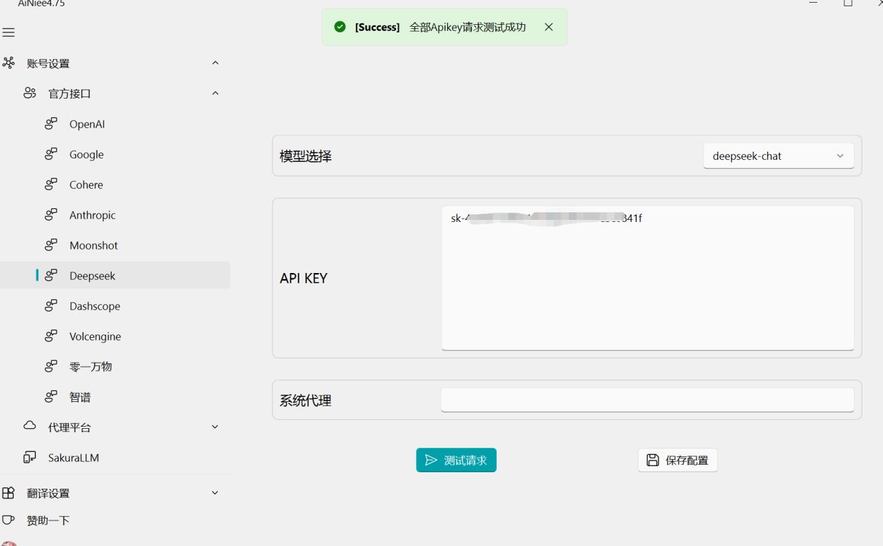 如下圖,將你從ds獲得的key複製粘貼進API KEY一欄,模型選擇deepseek chat,然後點擊測試請求如圖中所示出現“請求測試成功”綠框提示欄後點擊保存配置。