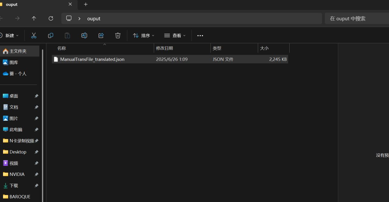 接下來點開我們創建的output文件夾,即可看到原本空白的文件夾出現了一份ManualTransFile.json文件,這就是我們翻譯好後的遊戲文本。
