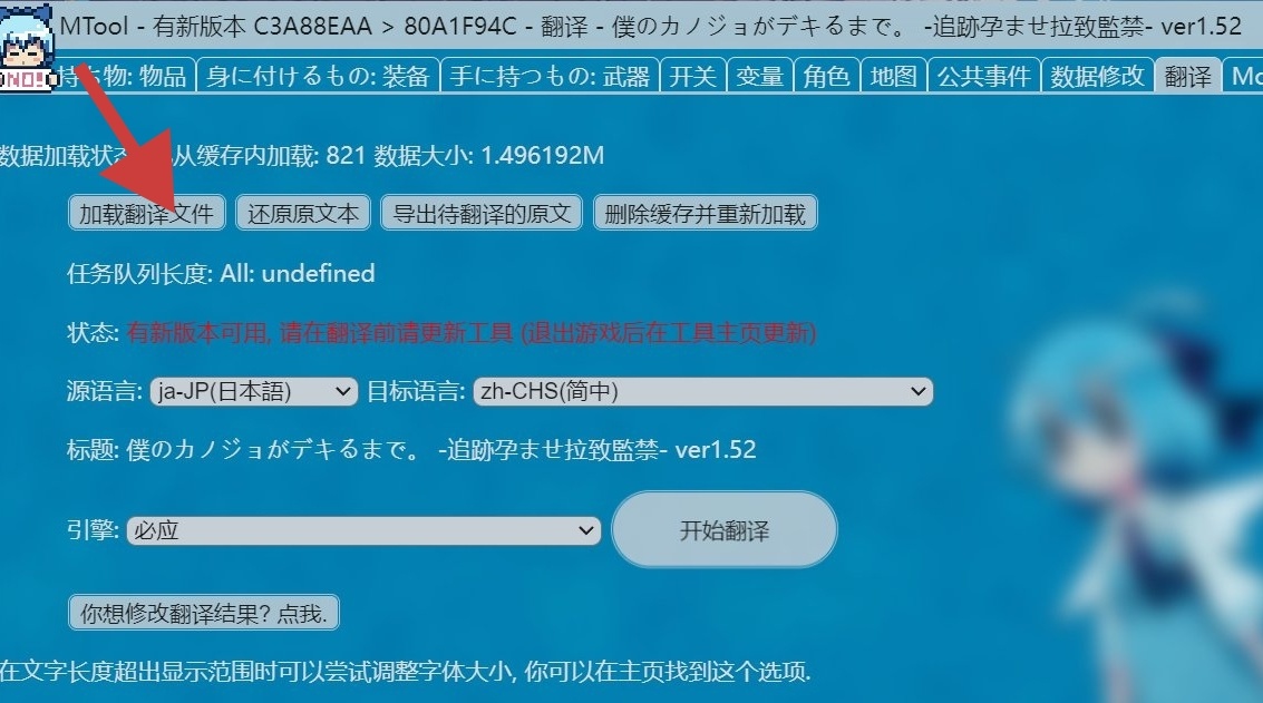 最後打開MTOOL工具再次加載遊戲,並在翻譯頁面中點擊加載翻譯文件並選擇好“output”文件夾中翻譯好的文件即可漢化成功。
