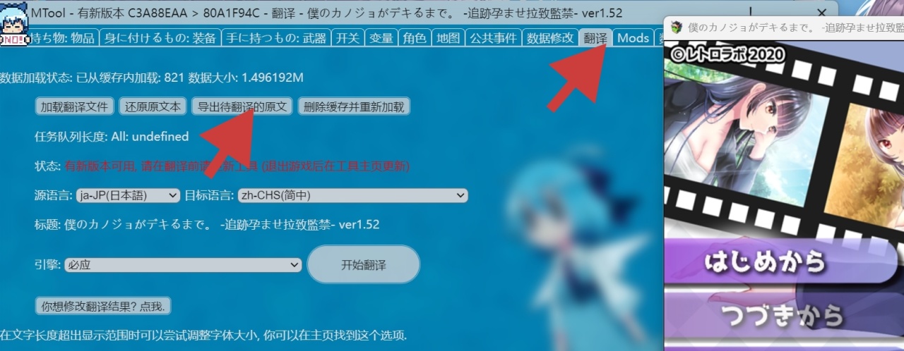 等待片刻遊戲自啓,MTOOL鏈接好遊戲如圖所示先點擊翻譯,再點擊導出帶翻譯的原文並點擊確定。