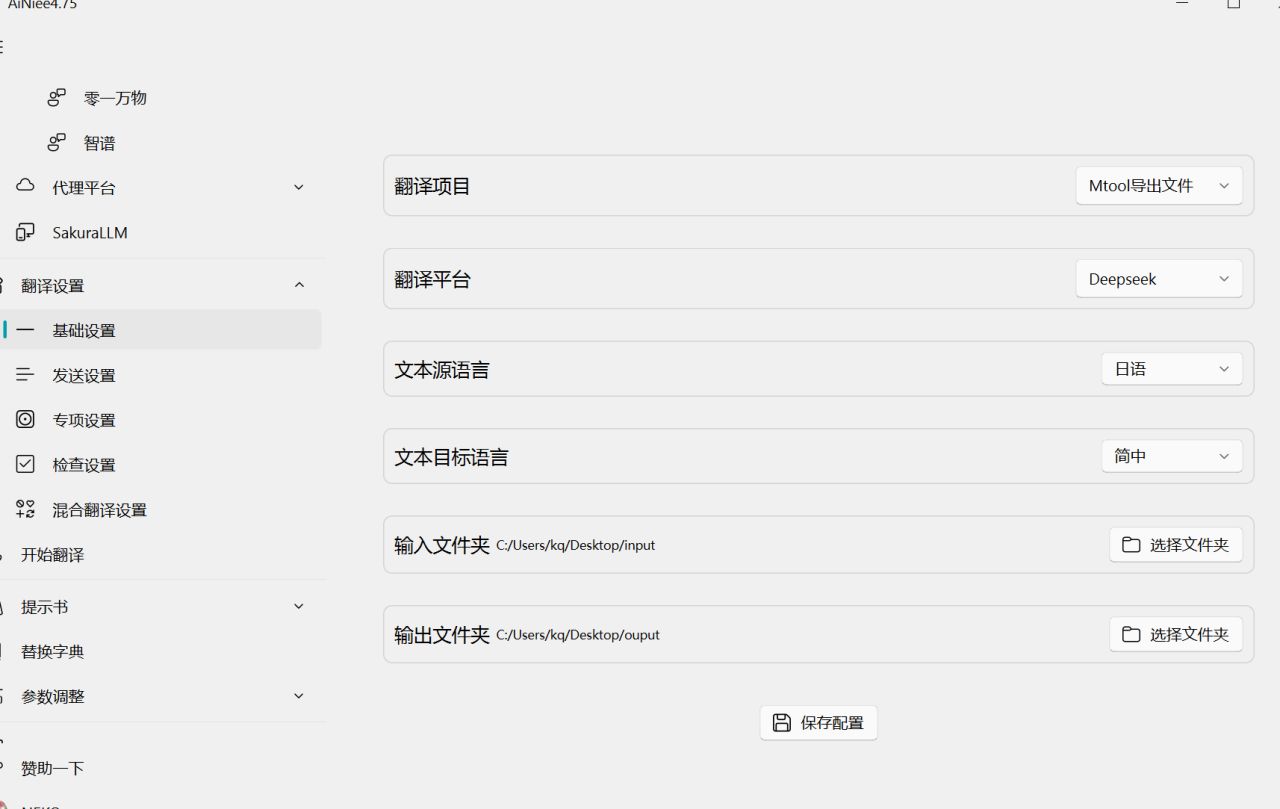 接下來點擊左側翻譯設置—基礎設置來到下圖所示頁面,各項設置參考圖中並新建兩個文件夾“input”“output”(文件夾名稱並不作硬性規定,你可以用你自己記得住的)