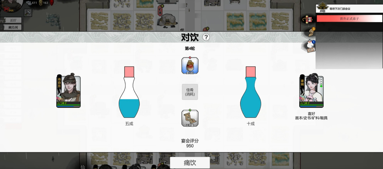 对饮(需要结合配菜,古玩。给对方斟酒。倒冒了对方就不用喝了,谁先把对方灌醉,谁就赢了。)这一众互动小游戏都和姜婉师姐玩了不少。
