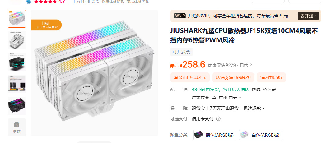 九鲨 JF13K 四风扇双塔风冷散热器包含全黑化无光、黑色 ARGB、白色 ARGB 三个版本,其中后两个版本顶盖包含格栅流光网格面板。目前黑化版本暂未上架,两个 ARGB 款到手价均为 259 元。