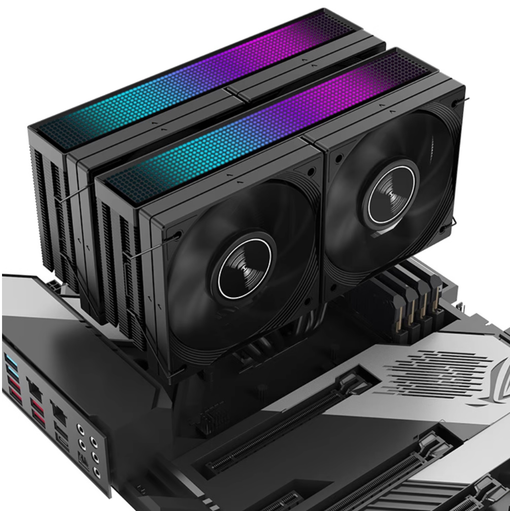 国内硬件厂商九鲨曾在数年前推出过双风扇并排的 JF13K 下压式散热器,而在最近该企业又推出另一款“双倍风扇”风冷:四风扇双塔的 JF15K。