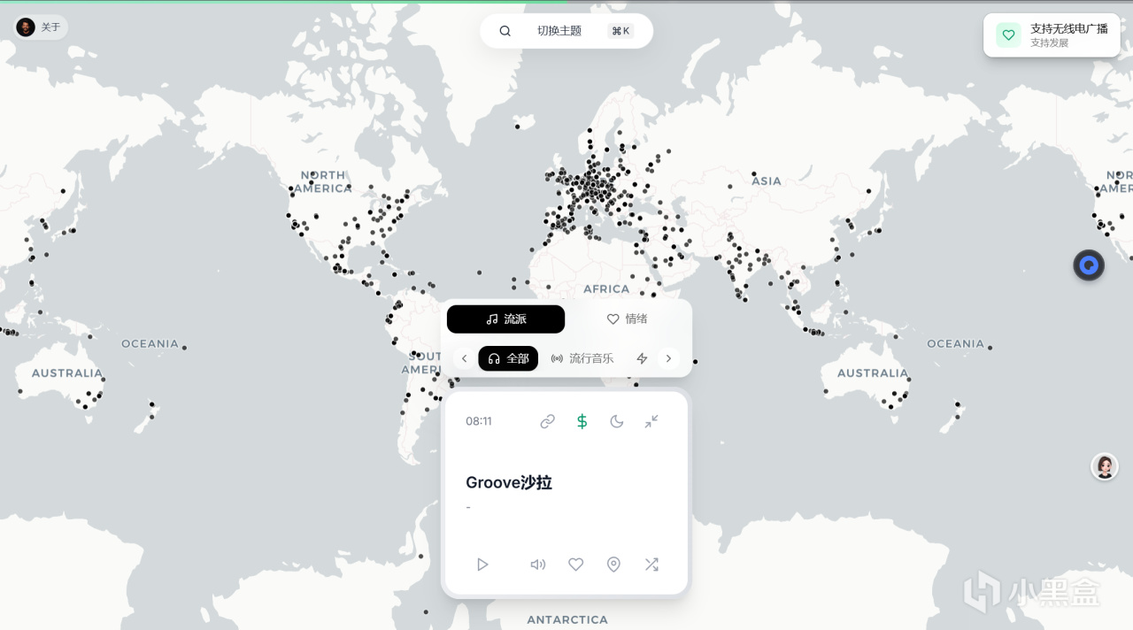 沉浸式体验:8000 + 全球电台免费听,点击地图选国家,按 R 键随机切台,支持按「放松 / 摇滚」情绪筛选。