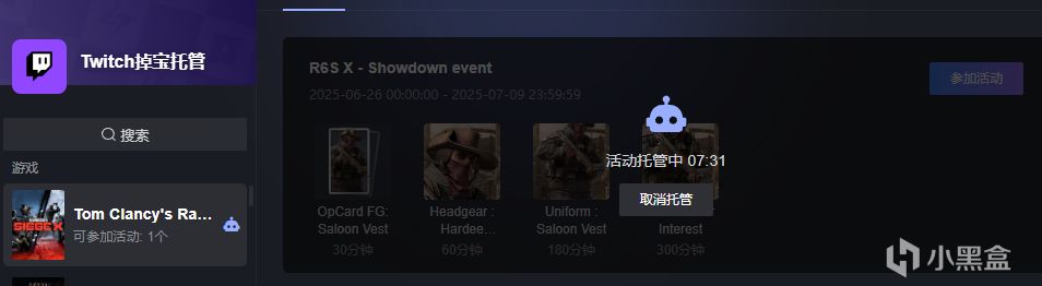 绑定完成后回到小黑盒加速器的掉宝工具,找到《彩虹六号 X》掉宝栏目,再点击参加,就可以一键托管啦!还可以排队参与别的游戏掉宝活动哦,非常方便!