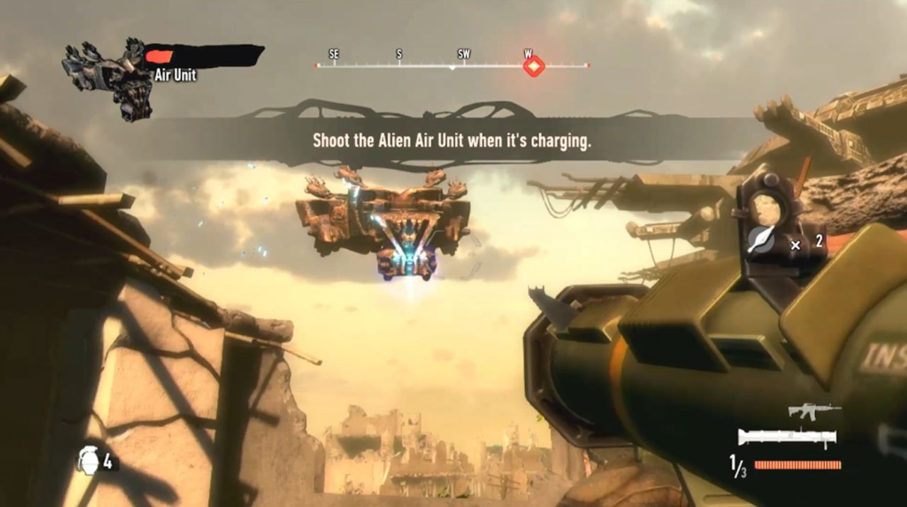 整款游戏里只有两种敌人:一种是叫做“alien(外星人)”的基础步兵;另一种是名为“air unit(空中单位)”的飞行支援舰,这些外星步兵只会做两件事:站着射击,或者蹲下来,但它们更加会通常做的事情只是突然出现,然后就站在那里不动,等着玩家来收割,而“空中单位”看起来就像漂浮在空中的纸袋,悬在半空中晃来晃去,剧情里描述它们有好几吨重,但实际看起来却像纸飞机一样轻飘飘的,非常的失真。