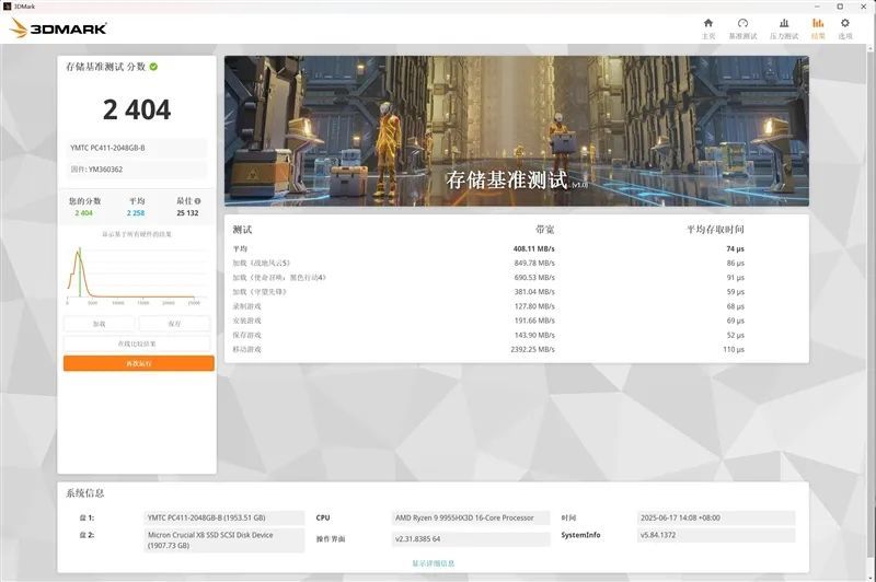PC411 1TB SSD总分是2404分,平均带宽408MB/s,移动游戏时,带宽能达到2392MB/s,平均存取时间74微秒。