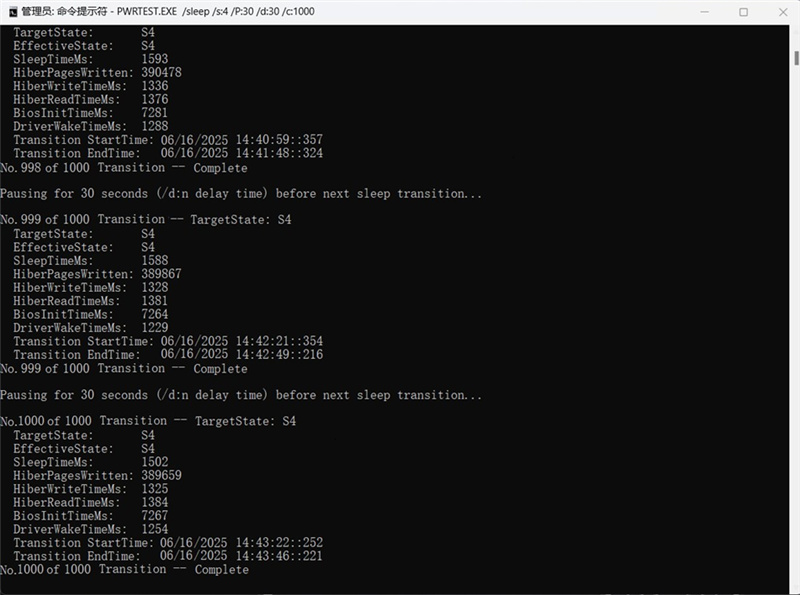 使用Windows系统自带的PWRTEST命令行工具,每次睡眠30秒,然后强制唤醒,共计睡眠唤醒1000次,全部正常完成,没有发生任何错误。