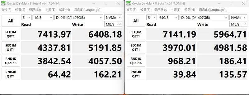 在这台机械革命苍龙16 Ultra笔记本上,PC411 2TB SSD轻松跑出了7400MB/s的顺序读取速度和6400MB/s的顺序写入速度。鉴于笔记本极其有限的散热空间,这基本上当前最好的速度表现。