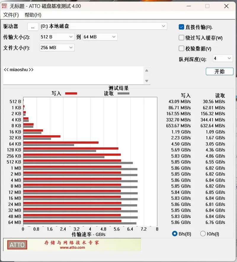 32K的时候,写入达到了2.23GB/s,读取速度为1.67GB/s。从512KB开始,写入速度稳定在5.8GB/s左右,读取速度则能达到6.7GB/s以上。