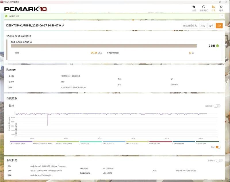 长江存储PC411 1TB SSD快速系统盘基准测试中获得2028分,存储带宽247MB/s,平均存取时间63微秒。