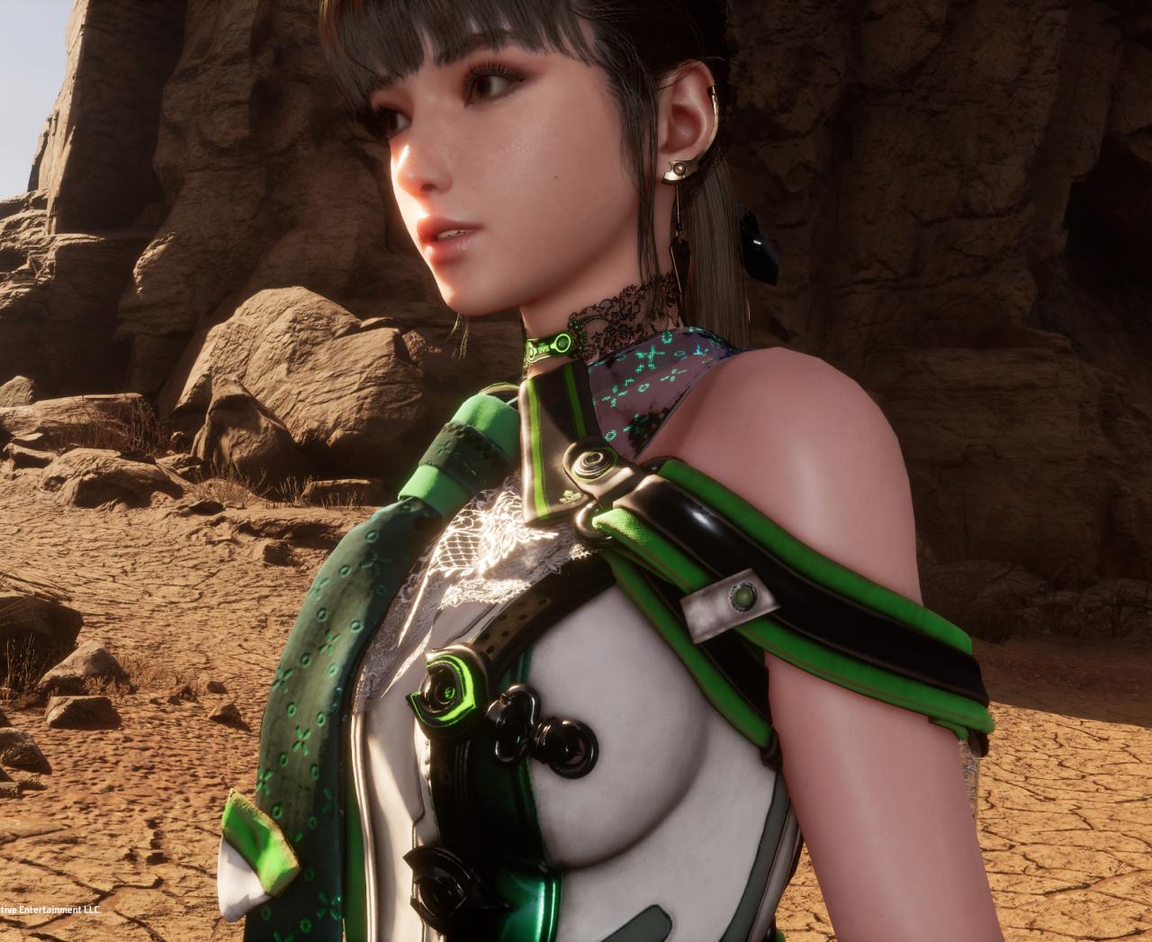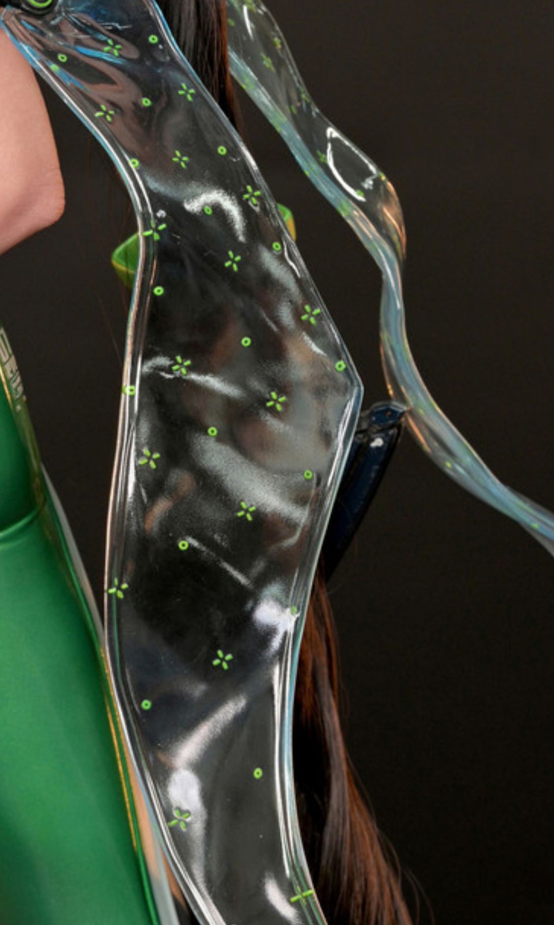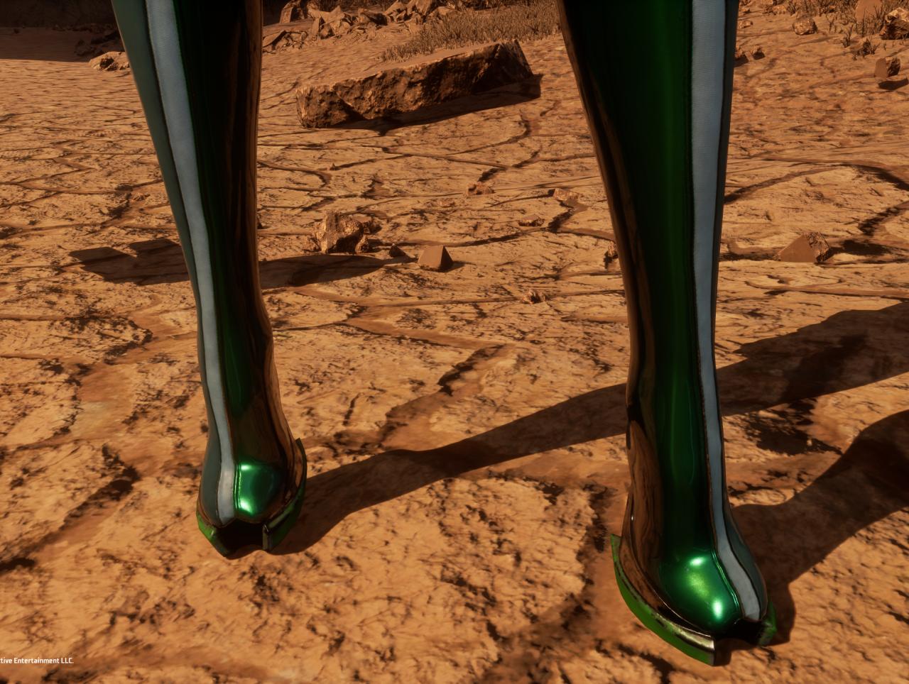 首先最顯而易見的,綠色電鍍反光的褲衩部分,和伊芙的緊身褲內側遙相呼應: