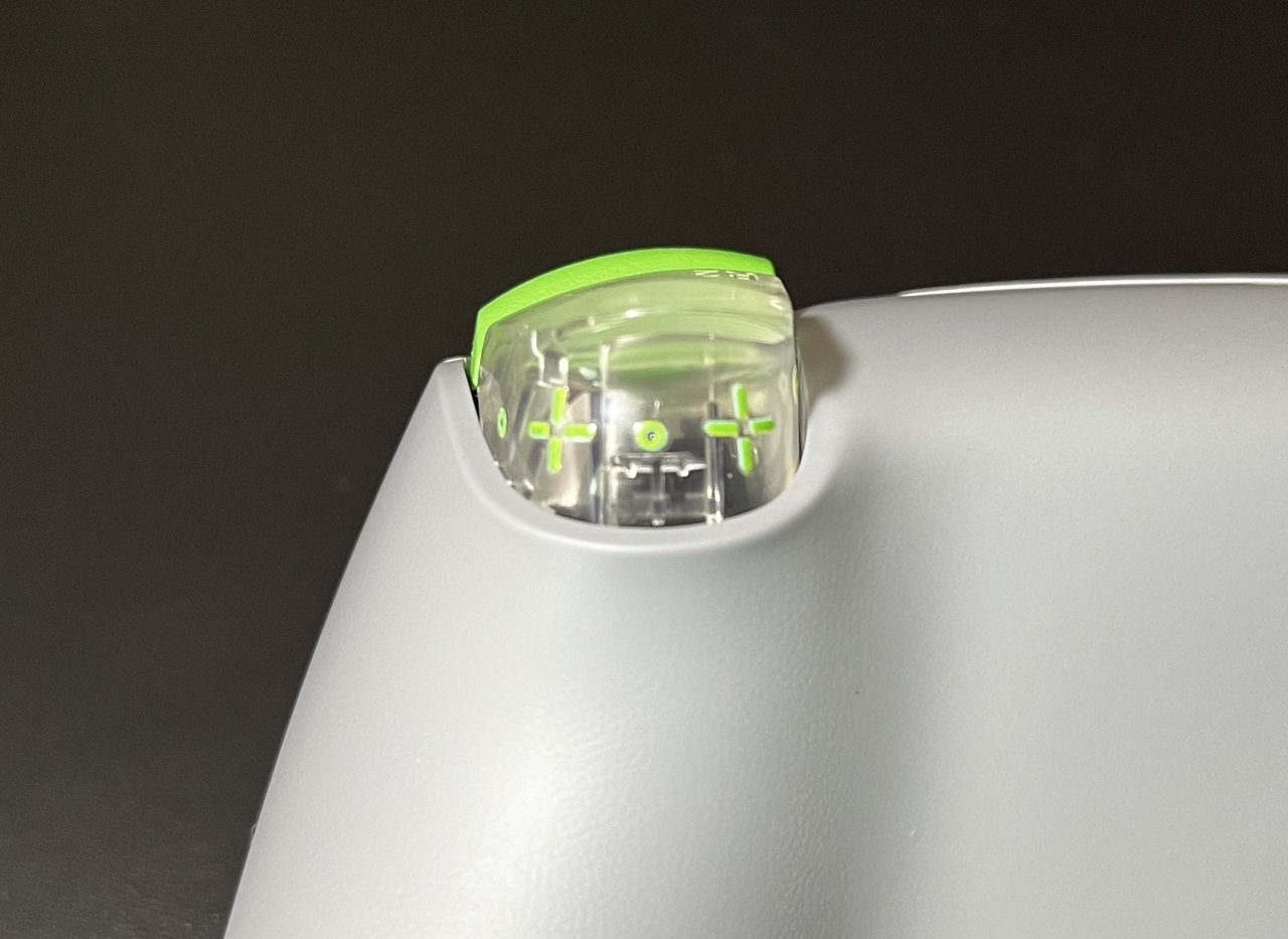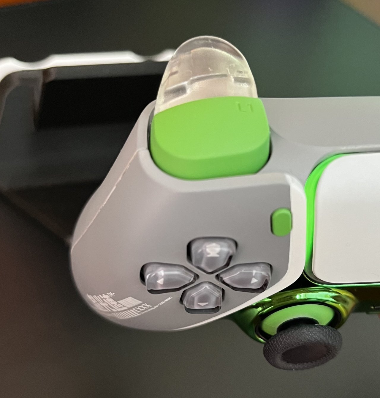 接下來是我最引以爲傲的設計,肩鍵採用綠色噴塗對應伊芙肩帶顏色,扳機用透明按鍵並印上綠色十字圓圈的全息圖案,對應伊芙背後的披風(也許是),這四個按鍵和衣服身上的元素位置是一一對應,這裏可以說是畫龍點睛之筆: