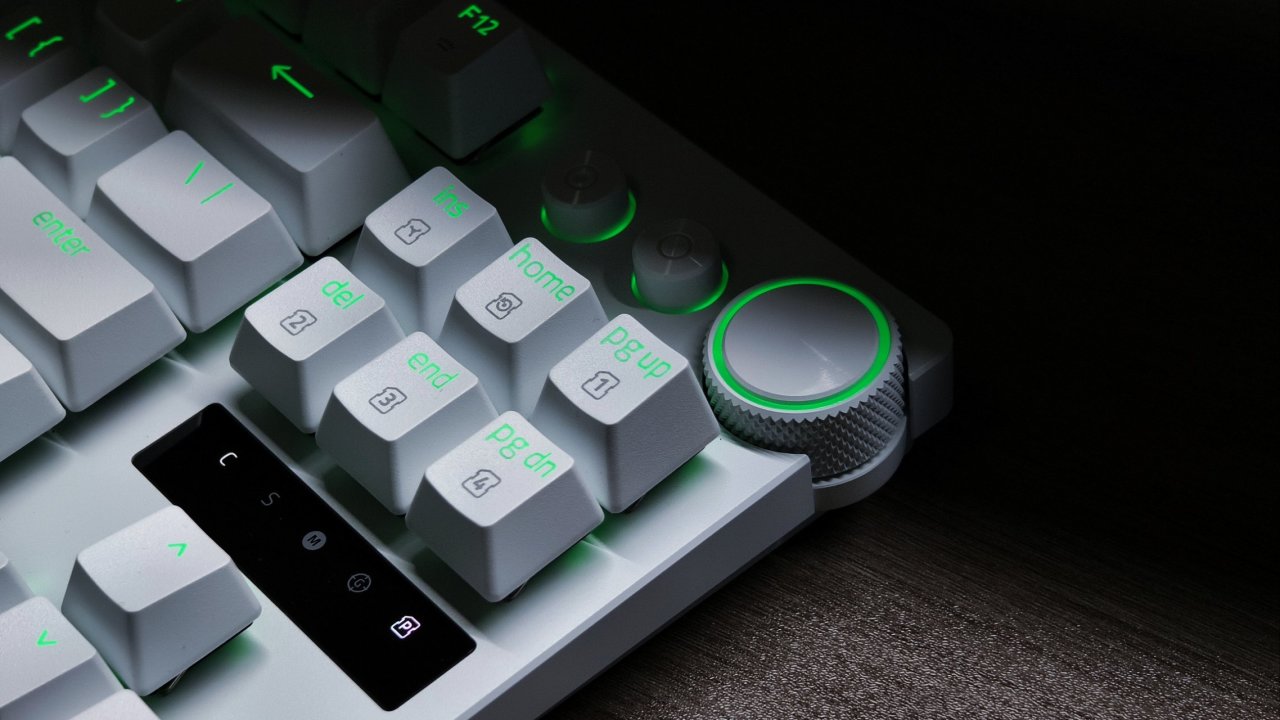 大家第一眼看过去应该会发现有一个很明显的特点,那就是这把键盘的右上角是带一个旋钮和两个按键的。旋钮这玩意最基础的功能就是旋转切换音量大小,按压可以暂停。当然你要是不喜欢也可以更改它的功能,比如说:缩放office比例,剪切,刷新,放大窗口,切换亮度高低这些他都是可以做到的。