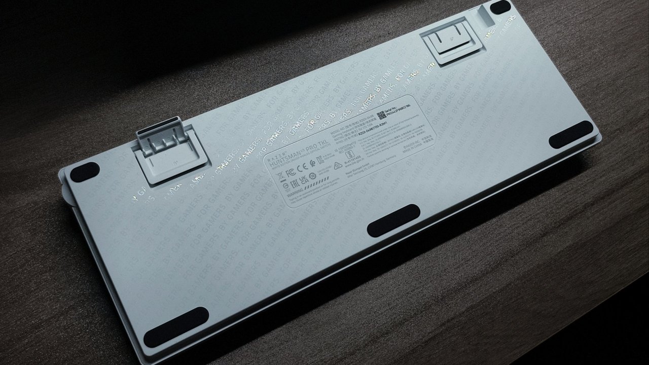 !键盘的背面你可以看到有5个硅胶脚垫+两个二段式脚撑。除此之外你还能看到密密麻麻是英文字符起到一个装饰的作用。我看了一下,这些英文字符写的是“FOR GAME”“BY GAME”,这其实是雷蛇的口号,翻译过来就是“始于玩家,赋予玩家”。