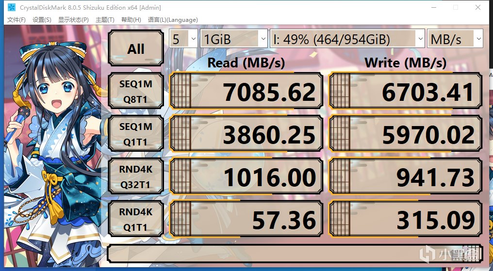 1M顺序读取速度为7085.62MB/s,1M顺序写入速度为6703.41MB/s。