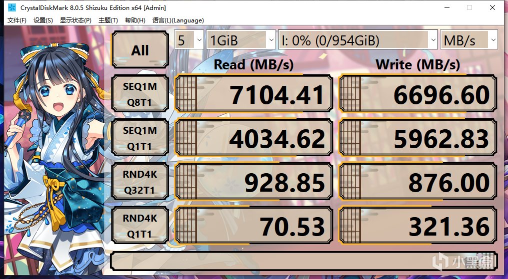 1M顺序读取速度为7104.41MB/s,1M顺序写入速度为6696.60MB/s。