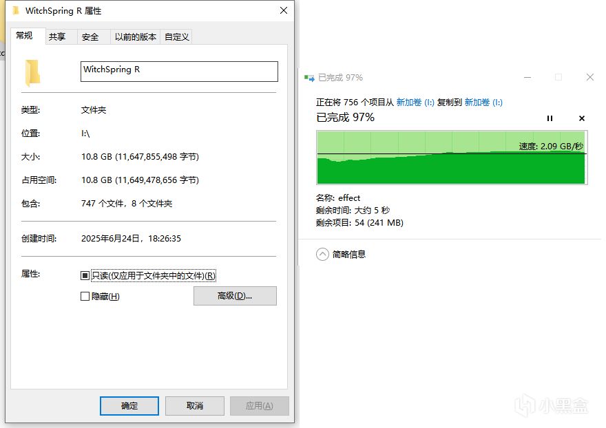 将747个文件,8个文件夹共10.8GB的文件在本盘中进行复制操作,仅需要5秒钟即可传输完毕。